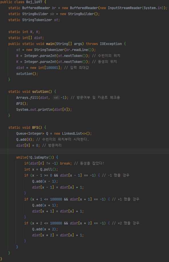 문제에선 동생을 찾기위한 최단거리를 묻고 있으니 각 정점마다 방문 가능한 세 곳을 방문하고 기록하며 가다가 동생의 위치가 방문처리 되면 break 후 출력하면 된다.