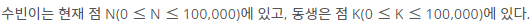 수빈이는 동생과 숨바꼭질을 하고 있다. 수빈이는 현재 점 N(0 ≤ N ≤ 100,000)에 있고, 동생은 점 K(0 ≤ K ≤ 100,000)에 있다. 수빈이는 걷거나 순간이동을 할 수 있다. 만약, 수빈이의 위치가 X일