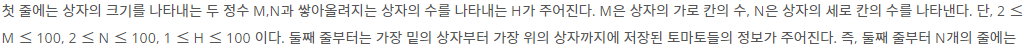 첫 줄에는 상자의 크기를 나타내는 두 정수 M,N과 쌓아올려지는 상자의 수를 나타내는 H가 주어진다. M은 상자의 가로 칸의 수, N은 상자의 세로 칸의 수를 나타낸다. 단, 2 ≤ M ≤ 100, 2 ≤ N ≤ 100,