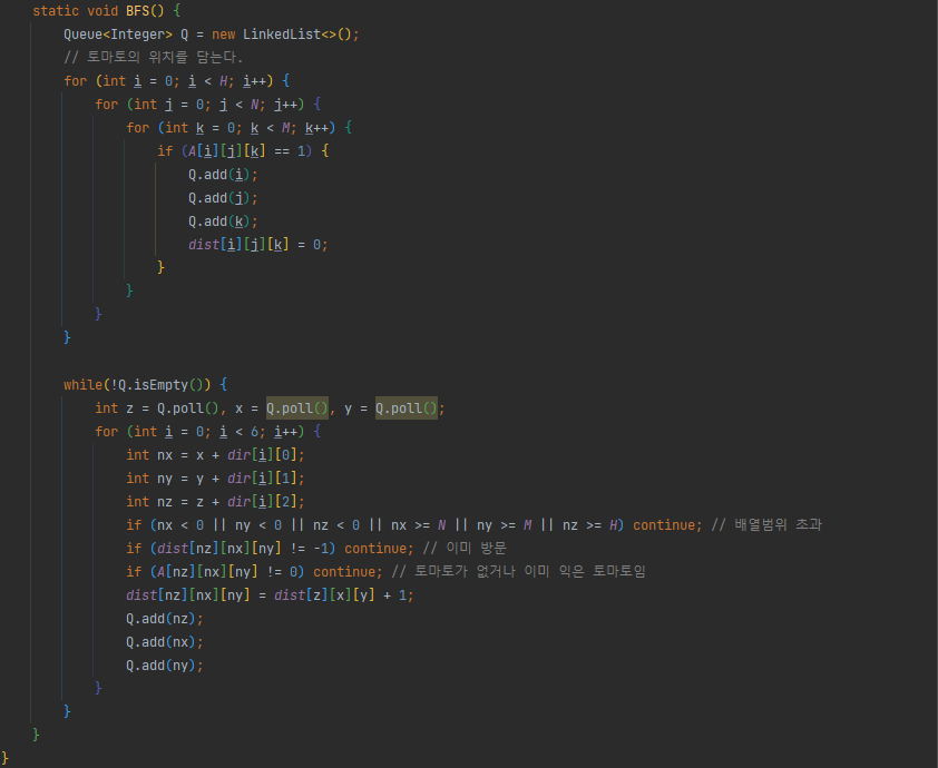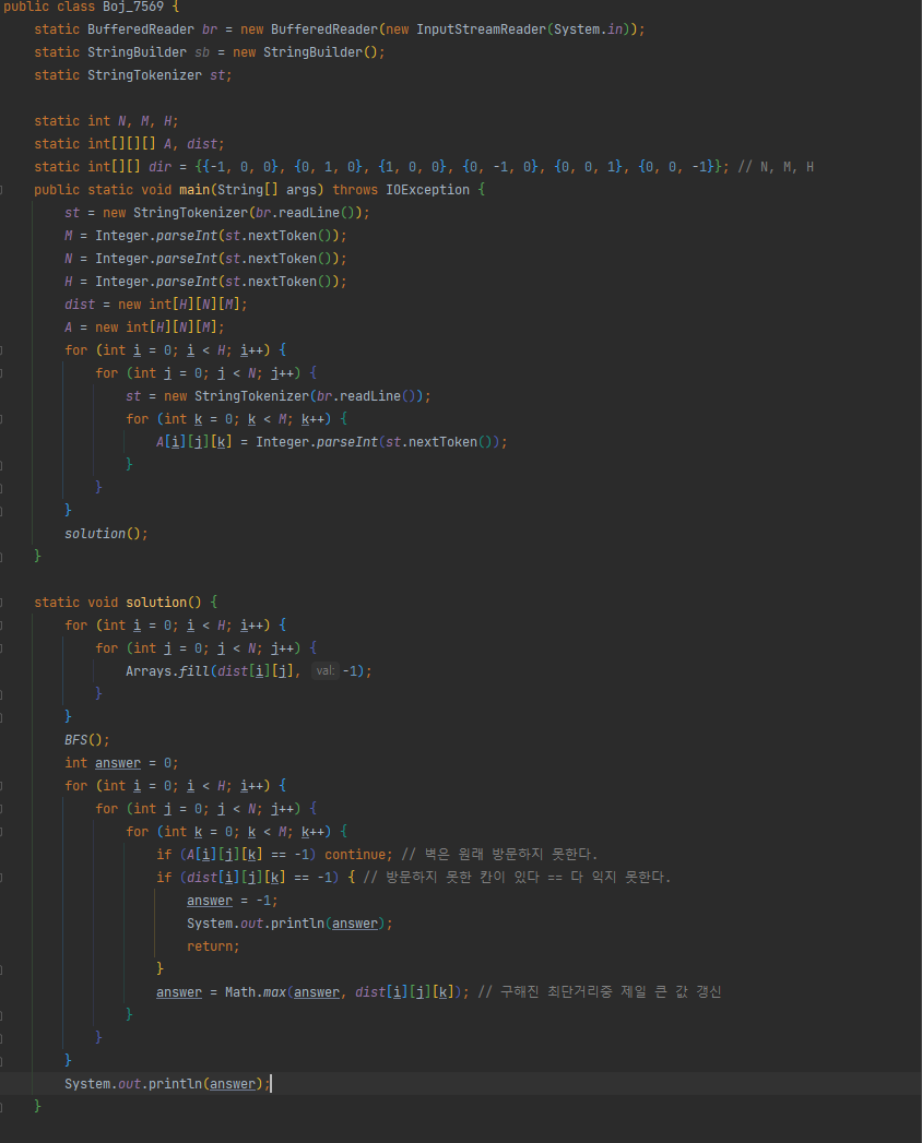 if (dist[i][j][k] == -1) { // 방문하지 못한 칸이 있다 == 다 익지 못한다.