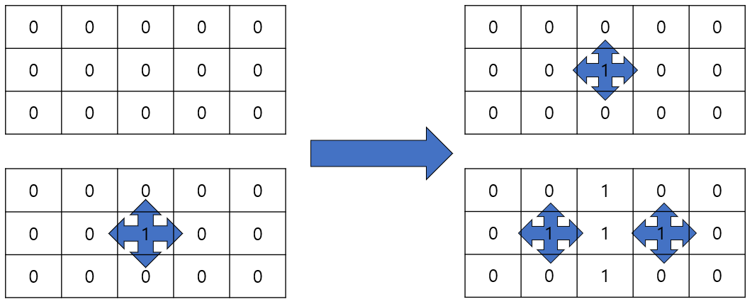 두 번째 입력 예제는 판은 하나 늘어났으나 사방을 가로막는 비어있는 토마토가 없기에 모두 익을 수 있다.