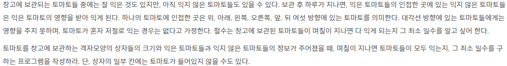 첫 번째 입력 예제를 그림으로 보면 토마토가 잘 익어가다가 비어있는 칸으로 인해 모두 익지 못하는 경우가 발생한다.