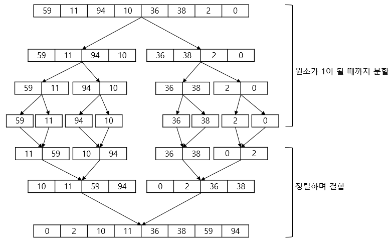 앞서 설명한 퀵 정렬은 특정 데이터를 피벗으로 선정하는 기준에서 부분 배열로 나눌 때 불균형하게 나뉘어 최악의 경우 O(n²)의 시간 복잡도가 나타나지만 합병 정렬은 항상 균일하게 나누기 때문에 O(nlogn)의 시간 복잡도를 보이는 정렬 방법이다.