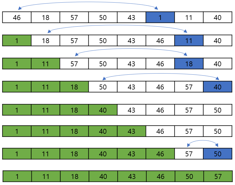 선택 정렬은 주어진 데이터에서 가장 작은 값을 선택해 앞쪽부터 채워 나가는 정렬 방법이다.