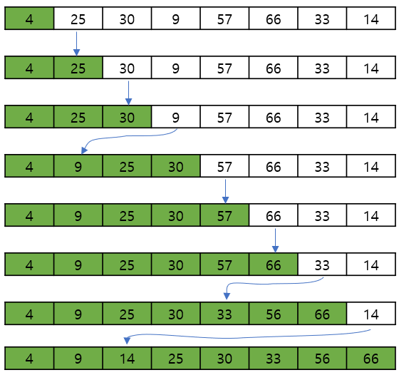 앞선 두 개의 정렬 방식과 마찬가지로 시간 복잡도는 O(n²)으로 동일하지만 입력 데이터가 거의 원하는 대로 이미 정렬된 채로 주어지면 O(n)으로 그 어떤 정렬 알고리즘보다 빠르게 동작한다.