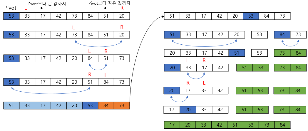quickSort(A, L, pivot - 1); // pivot 기준 왼쪽 배열 정렬