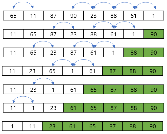 삽입 정렬이 작은 값부터 정렬을 했다면 버블 정렬은 데이터의 시작점부터 끝점까지 이동하며 인접한 인덱스를 비교해 나가며 큰 값부터 채워나가는 정렬 방식이다.