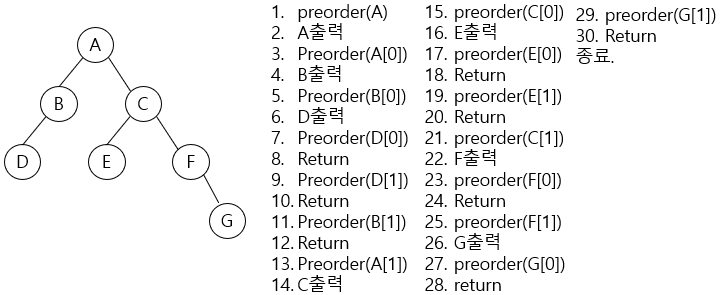 출력 - 왼쪽 - 오른쪽 순으로 반복하며 뻗어나가게 되는데 위 함수의 실행되는 순서는 아래와 같다.