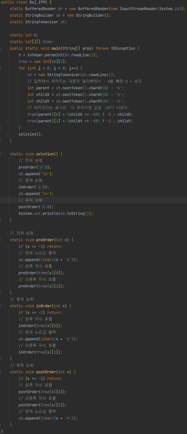 왼쪽, 오른쪽으로 뻗어 나가는것은 동일하지만 순회 방법에 따라 출력 부분이 코드상 어디에 위치해야 하는지를 생각하며 풀어보자!