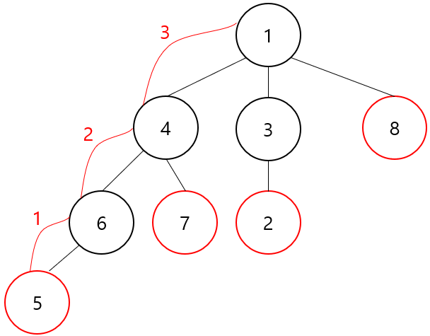 말단 노드인 5번 노드는 루트 노드까지 총 세 번을 이동해야 하며 문제로 비유하자면 세 턴을 필요로 한다.