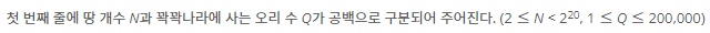 첫 번째 줄에 땅 개수 N과 꽉꽉나라에 사는 오리 수 Q가 공백으로 구분되어 주어진다. (2 ≤ N < 220, 1 ≤ Q ≤ 200,000) 두 번째 줄부터 차례로 Q개의 줄에 걸쳐 i+1번째 줄에는 i번째 오리가 원하