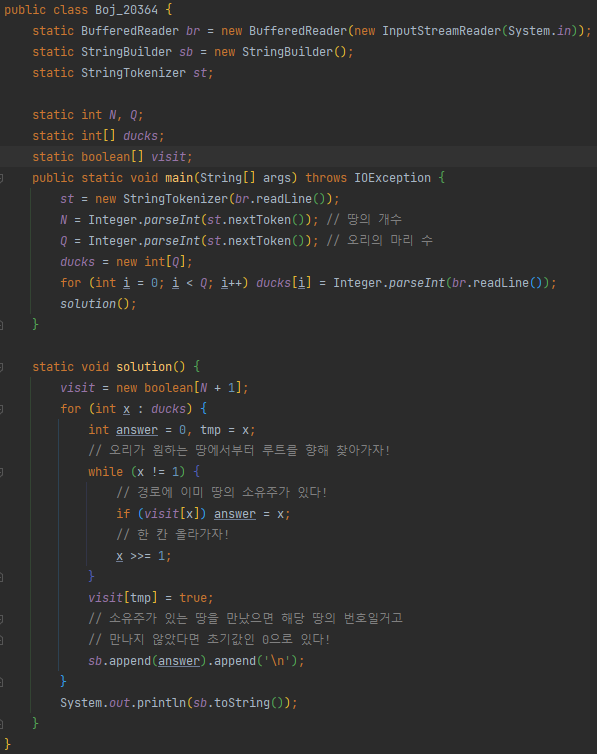 입력받은 오리가 원하는 땅에서부터 한 칸씩 시프트하며 루트를 향해 가고 boolean 배열에 저장해두자!