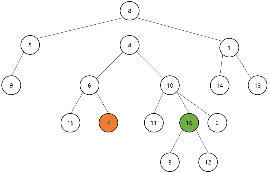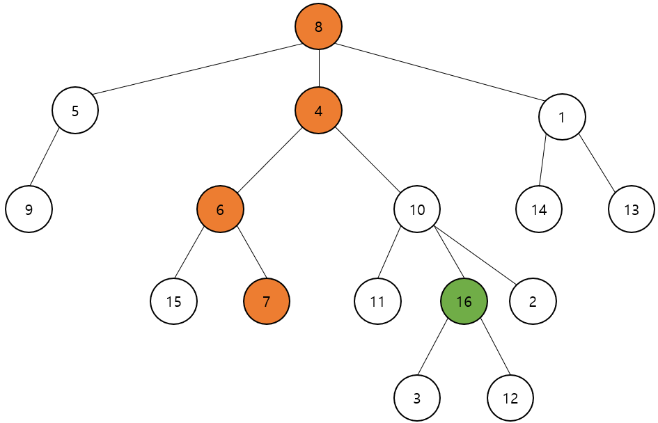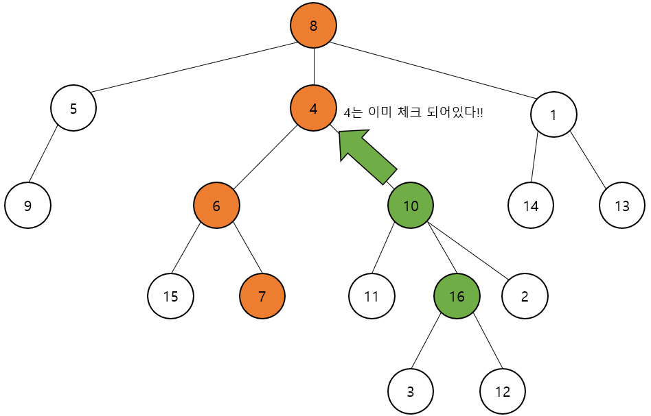7이 루트 노드인 8에 체크하며 도착했으니 두 번째 노드인 16도 체크하며 이동하다 보면 4에서 앞 노드가 이미 체크한 것을 확인할 수 있다.
