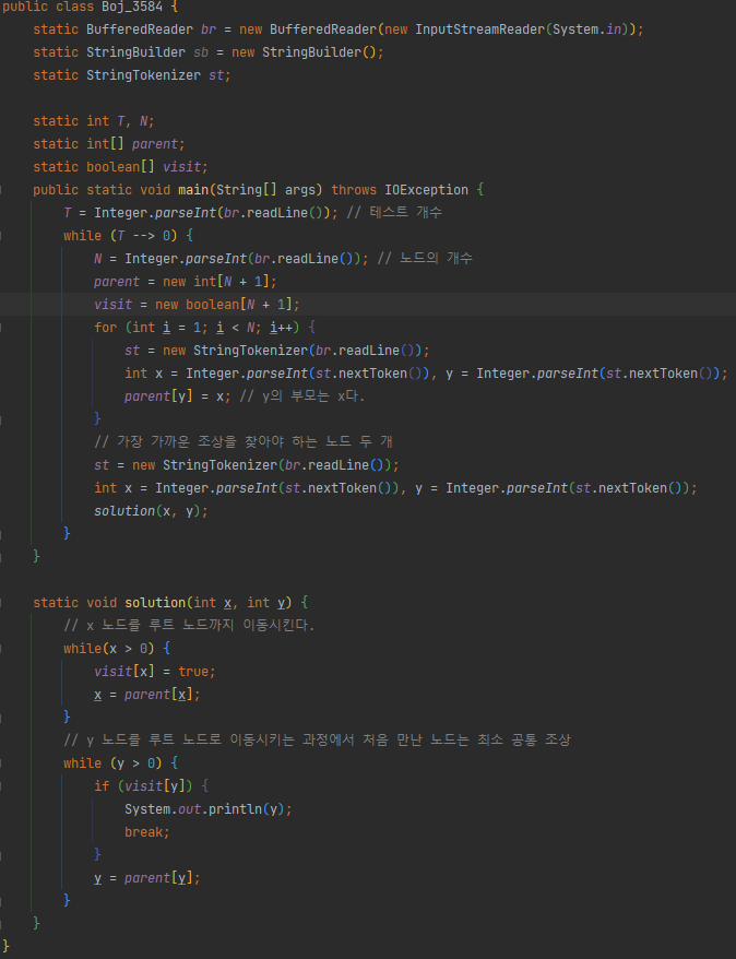 위 그림들과 같이 각 노드의 부모를 타면서 루트를 이동해야 하니 최초 입력 시 각 노드의 부모를 받아주고 한 개의 노드 먼저 루트로 이동시키고 두 번째 노드도 루트로 이동하는 도중 처음으로 만난 체크되어 있는 노드가 최소 공통 조상 노드가 된다.