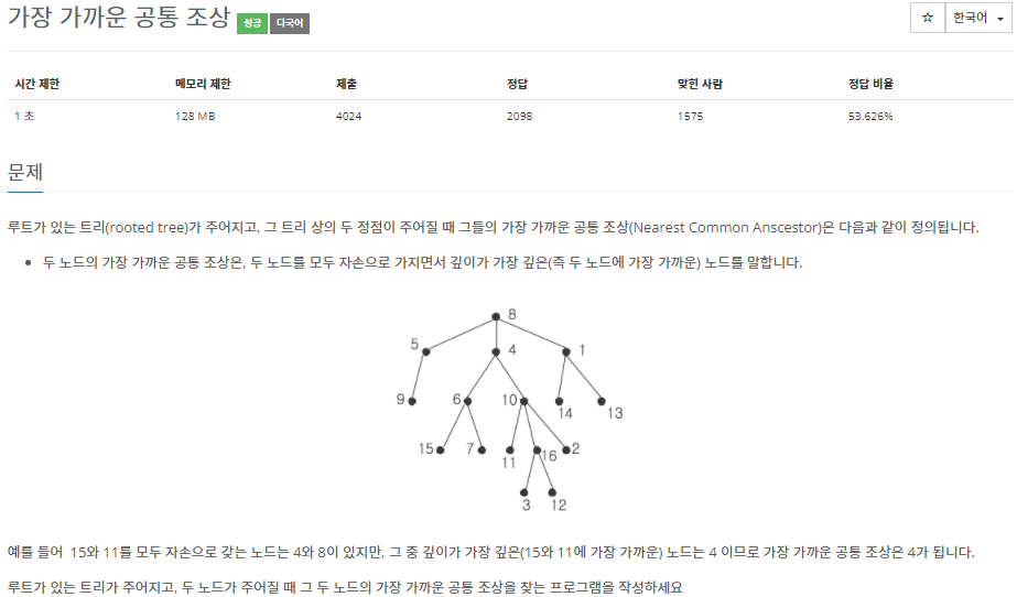 루트가 있는 트리(rooted tree)가 주어지고, 그 트리 상의 두 정점이 주어질 때 그들의 가장 가까운 공통 조상(Nearest Common Anscestor)은 다음과 같이 정의됩니다. 두 노드의 가장 가까운 공통 조상은, 두