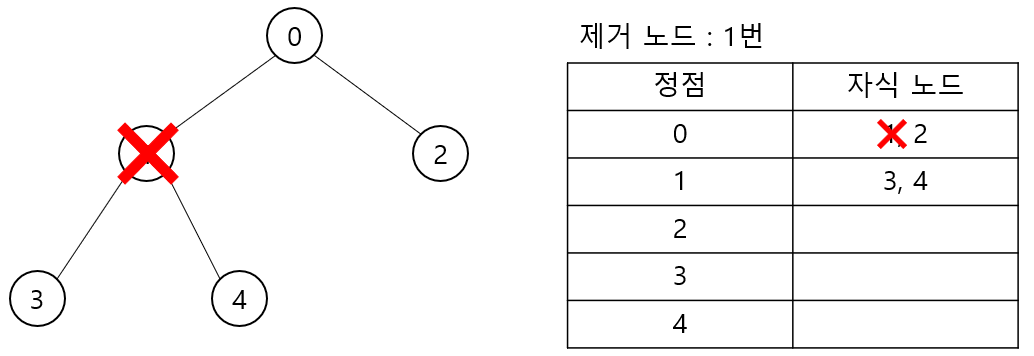 예제 입력 2번을 그림으로 보자 (1번 노드를 지울 경우)