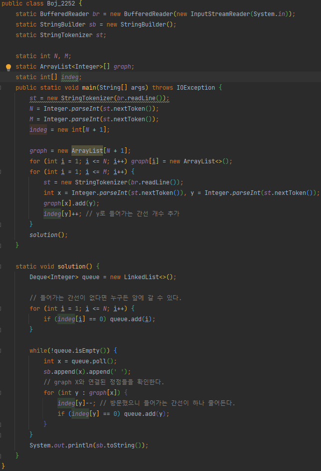 indeg[y]--; // 방문했으니 들어가는 간선이 하나 줄어든다.