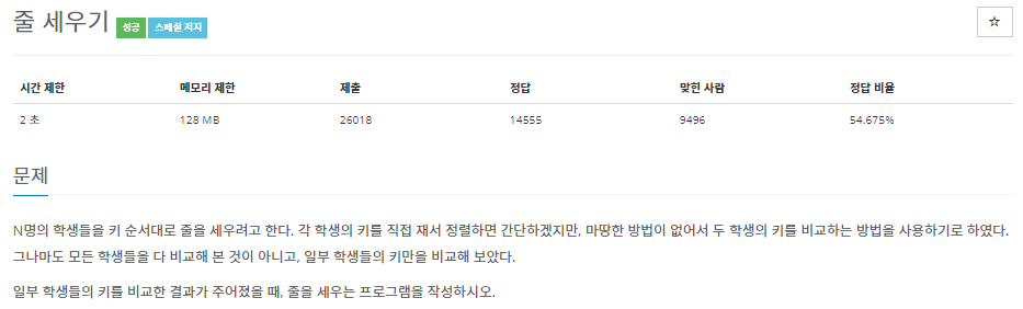 문제 속 요구사항은 일부 학생들의 키 비교 입력을 기준으로 전체 학생들을 줄 세우면 되는 문제입니다.