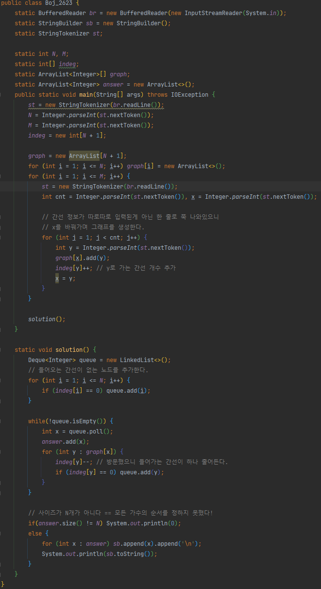 첫째 줄에는 가수의 수 N과 보조 PD의 수 M이 주어진다. 가수는 번호 1, 2,…,N 으로 표시한다. 둘째 줄부터 각 보조 PD가 정한 순서들이 한 줄에 하나씩 나온다. 각 줄의 맨 앞에는 보조 PD가 담당한