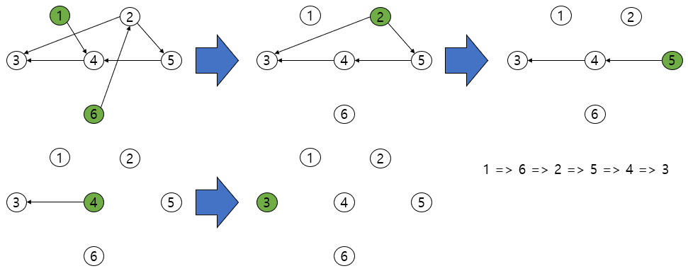 입력 받은대로 단방향 그래프를 그리고 자신에게 향하는 간선이 없는 노드를 차례대로 삽입하면 문제의 정답을 구할 수 있습니다.