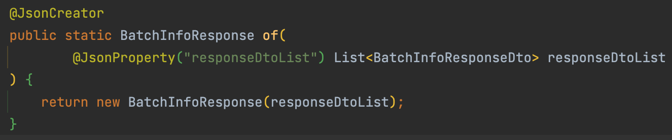 @JsonCreateor와 @JsonProperty를 사용하는 방법을 찾았고 다음과 같이 수정 후 정상 작동하는것을 확인했다.