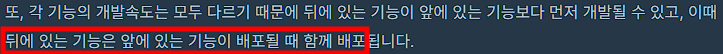// 2. 뒤에 있는 기능이 먼저 개발되도 앞에 기능이 끝나야 같이 배포된다.