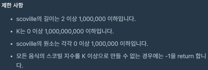 주어진 스코빌 지수 배열을 그저 우선순위 큐에 넣기만 하면 정렬 부분은 끝났고,